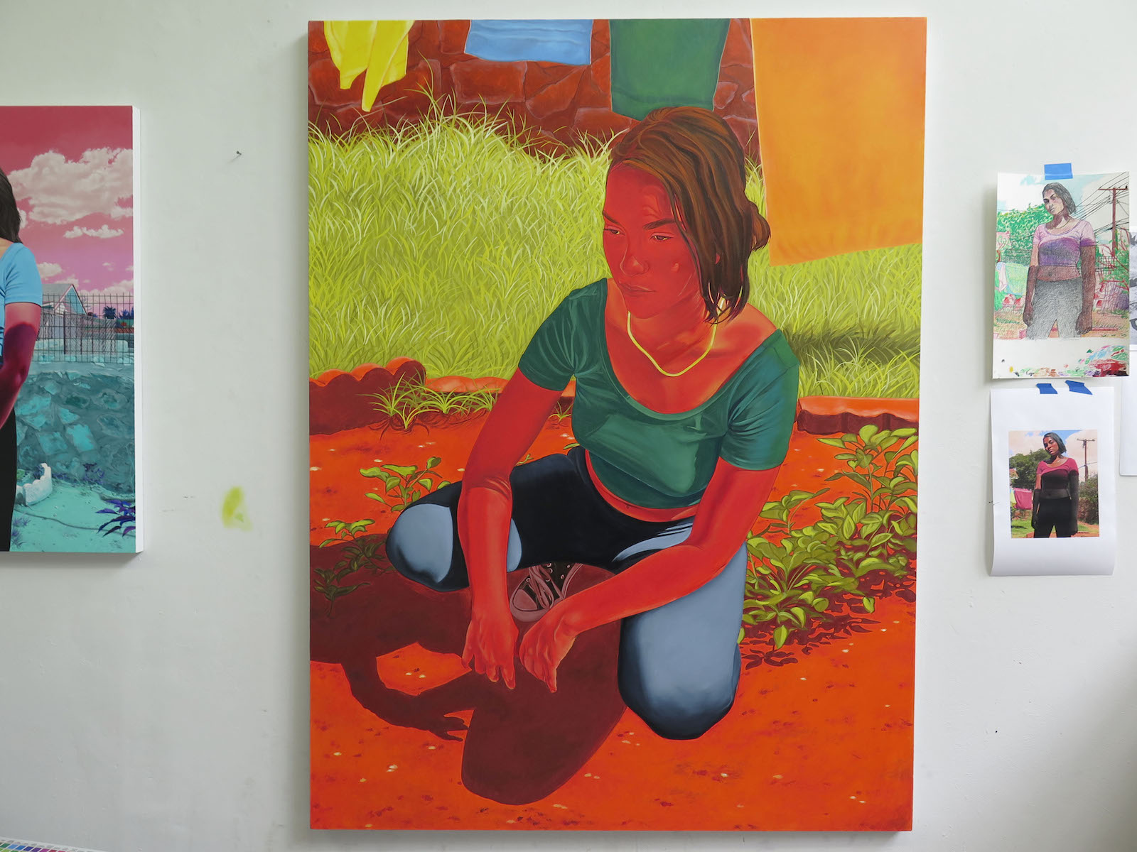 Her color palette is inspired by the culture and landscape of Mexico; the colors saturated, sometimes over-saturated. Her figures seem to be burning in the hot desert soon.