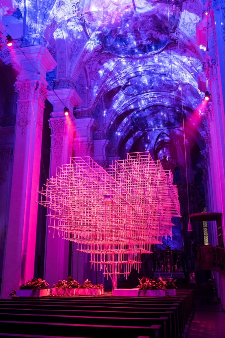 As I sat in this beautiful old church for almost two weeks not having a clue what to do, I discovered that there were doves everywhere, in pictures in the side chapels, in the main altar, and as stucco sculptures all over the place. So I started to research about the symbol of the dove, where it comes from, the meaning and what it means for us today. I tried to convert the idea of „spirit, holy spirit and peace“ ( all those terms stand behind the symbol of the dove ) into a three-dimensional installation and into my way of working.