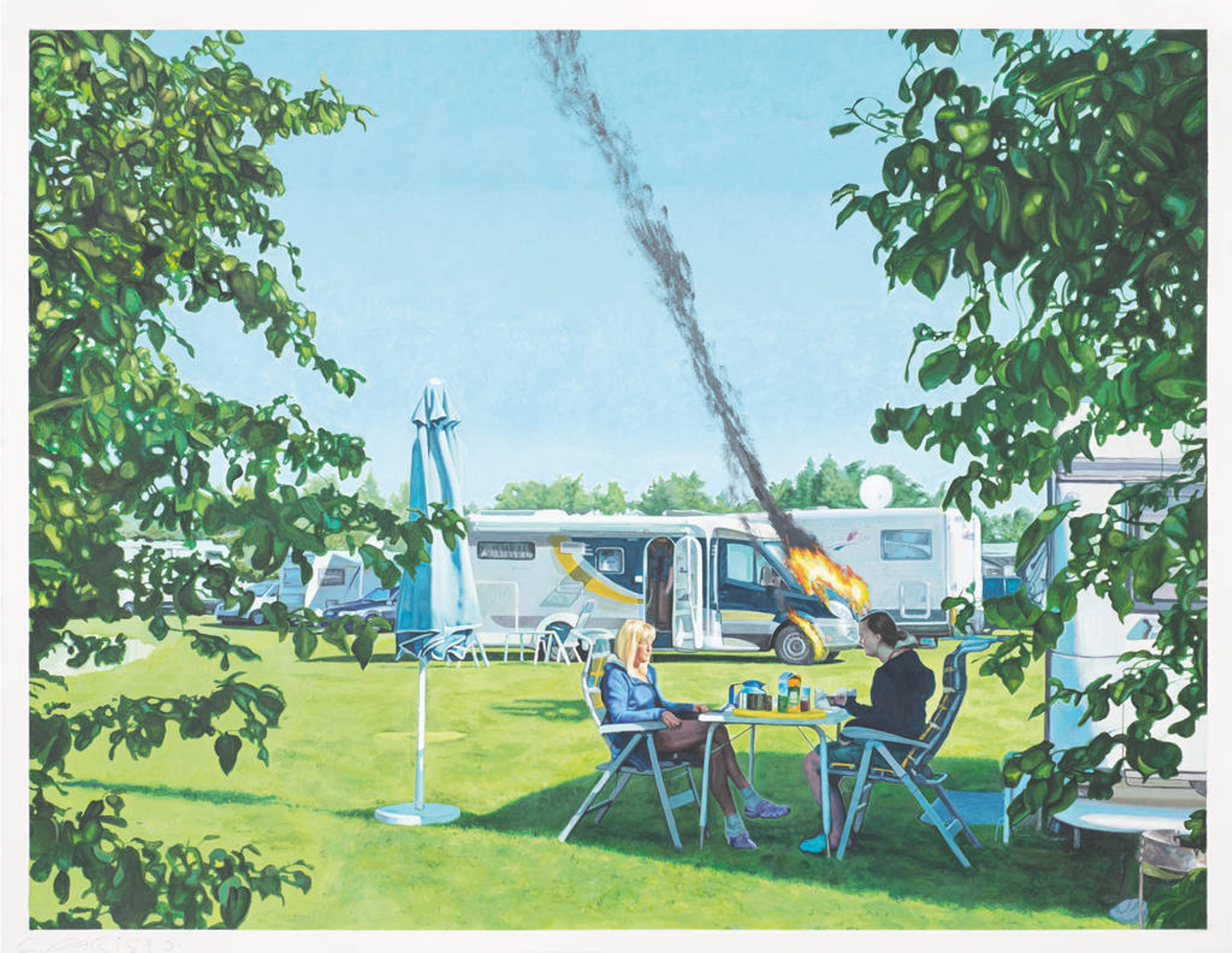 Feinmalerisch und mit leuchtenden Farben vermitteln sie idealtypische, deutsche Urlaubsszenen: Saftig grüne Idyllen, ein strahlend blauer Himmel, lachende Gesichter – doch mittendrin etwas, das da nicht hingehört, das irritiert.