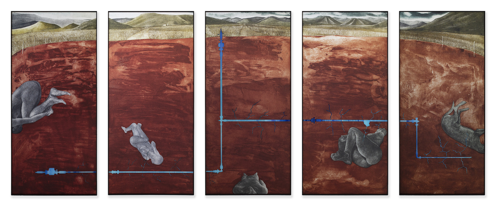 les brins d’herbe bien délimités et les traînées subtiles de la surface laissent deviner des corps gris-bleu défunts, peu à peu balayés à la surface par un glissement de boue ou au contraire totalement enfouis.