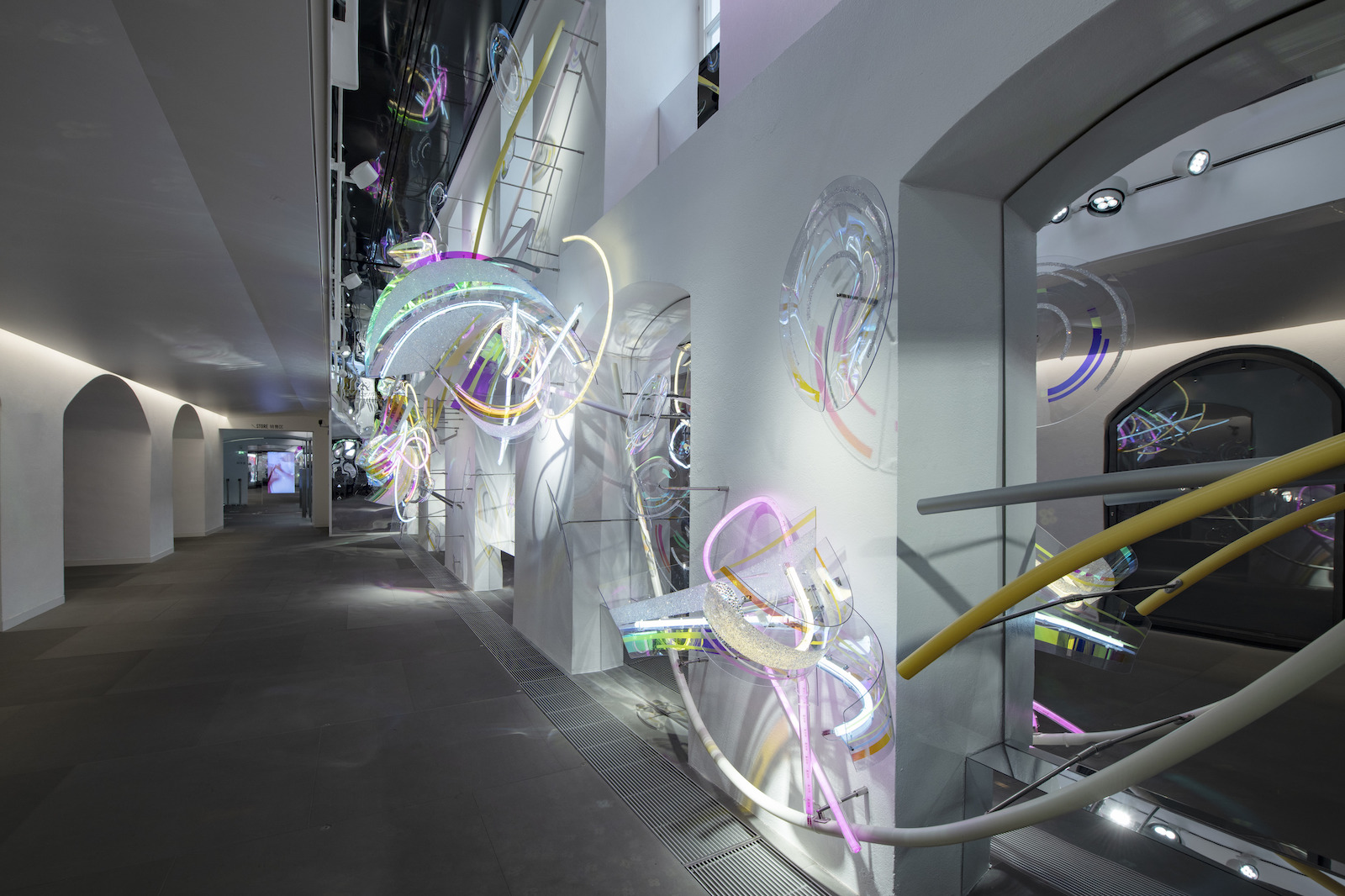 Je recherche une sorte de profondeur mécanique dans le matériau, une certaine vivacité: il s’agit de regarder à travers, de refléter, superposer, casser, colorer. Ma méthodologie et ma technique deviennent une expérience sensorielle que l’on ne soupçonnait peut-être pas au départ. Je vise à dissoudre la dichotomie entre technologie et atmosphère. Le matériau, même artificiel, se conjugue alors à la nature et donc à nos sens.